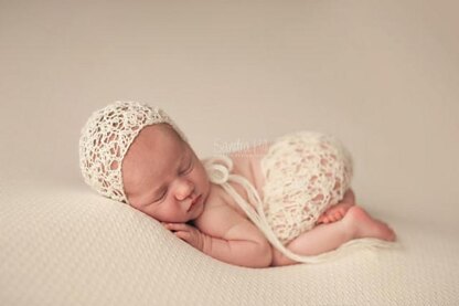 This is a PDF knitting PATTERN for a beautiful, lacey and striking knit bonnet and pant set for use as a newborn photography prop. This pattern is really only suitable for ADVANCED knitters and it needs total concentration to make, but the finished design is well worth it!