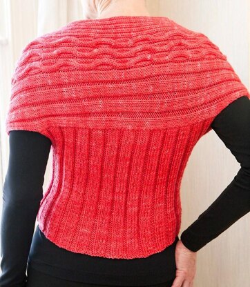 The wrap is created with one long, straight piece that goes up around the shoulders then back down, plus a small back panel, nothing more. The springy nature of the ribbed pattern and the unusual construction of this piece make it amazingly adaptable to different body sizes and shapes with just a few minor adjustments to only two pattern sizes.