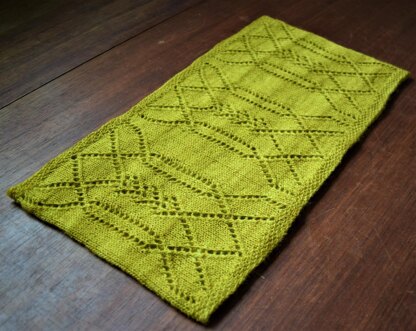 The pattern includes a chart for the lace work. The even rows of the lace is worked in plain knit. The lace stitches involved include: yarn over, k2tog, ssk, sl1-k2tog-psso, knit through back loop.