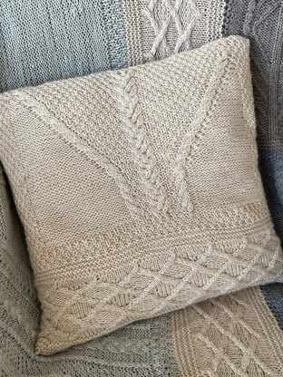 This pillow is knit in one piece. It features two different sections on the front of the pillow. Of course, there are lots of fun cables! Who doesn't love a cable pillow?