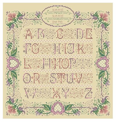 Designed by: Sandy Orton. This beautiful wedding sampler makes the perfect wedding gift! The intricate and lacy style of this timeless piece by Sandy Orton depicts the wedding alphabet with hidden words like Bride, Groom, Vows, Love, Promise, and more. Surrounded by a delicate floral border which is personalized for the happy couple, this piece is sure to become a cherished heirloom.\n