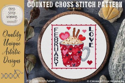 A wonderful monthly mug counted cross stitch design.\nCross Stitch Pattern Designed by Marcia Manning.\nStitch just the mug or the entire design. Either makes a wonderful project.\nConsider stitching on a matching wood blank too - how fun!\n92 stitches wide by 92 stitches high.\nPDF is a COLOR counted cross stitch chart which lists suggested DMC floss colors, and includes a color picture.\nStitched design size is as follows:\nSize 11 count: 8.36 x 8.36 inches or 21.24 x 21.24 cm\nSize 14 count: 6.57 x 6.57 inches or 16.69 x 16.69 cm\nSize 16 count: 5.75 x 5.75 inches or 14.61 x 14.61 cm\nSize 18 count: 5.11 x 5.11 inches or 12.98 x 12.98 cm