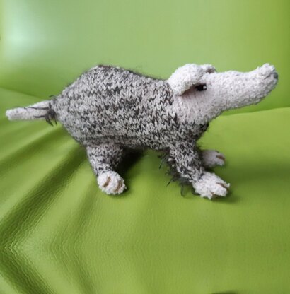 It measures 23 cm end and it is an easy knit. The aardvark is knitted on double pointed needles. The knit asks for some minor intarsia color work and loop stitches (which are explained in the pattern.