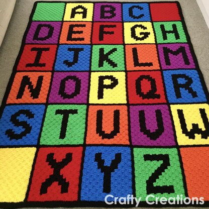 This crochet pattern provides instructions to make an alphabet blanket, approximately 164 cm x 118 cm. Perfect for a child, it will keep them warm, as well as being educational! Let them learn the colours of the rainbow (including primary and secondary colours), and have fun finding colour patterns in the design - all while learning the capital letters of the alphabet! The finished blanket is large enough to be used on a single bed, or even as a lap blanket for a teen or adult.