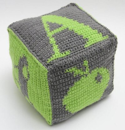 Crochet baby cube pattern pdf made up of ABC letter squares and Apple, Bell and Car colour motifs.