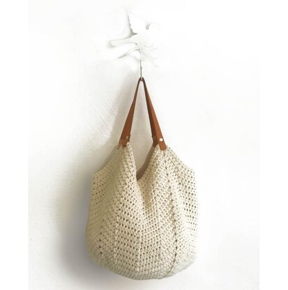 The size of the bag will vary slightly depending on the thickness of your yarn and the tension used but you should obtain an approx. size of 40cm width x 37cm height when flat ( without the strap).