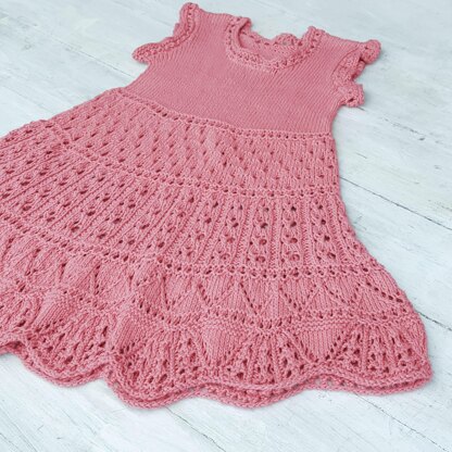 Adalie is a delightful summer dress pattern for girls that like lace skirts. A gently scalloped hem and pretty eyelets feature on the skirt. Definitely a great dress for special occasions. Worked seamlessly from the bottom up, with a stockinette stitch bodice. Finished with Eyelet Trim on sleeves and neckline. Sizes: 6- 12 months, 1-2 years, 2-3 years, 3-4 years, 4-5 years, 6-7 years To fit chests of 46- 50- 54- 57- 60- 64 cm or 18- 19 ½ - 21- 22 ½ - 23 ½ - 25 " Total length from shoulder to hem: 44- 48- 52- 54- 56- 60 cm or 17 ¼ - 19- 20 ½ - 21 ¼ - 22- 23 ½ " Materials: 100 % cotton yarn, fingering weight, Yarn Suggestion: Rowan Summerlite 4 Ply 4- 4- 5- 6- 6- 7 50g balls; yarn length 175 m per 50 g ( Coral Blush) Knitting needles: Circular and DPN's in 3 mm (US2.5) circular in two lengths: 40 cm and 80 cm, 16" and 32 " Tension/ Gauge: 28 sts and 36 rows to 10 cm in stockinette stitch