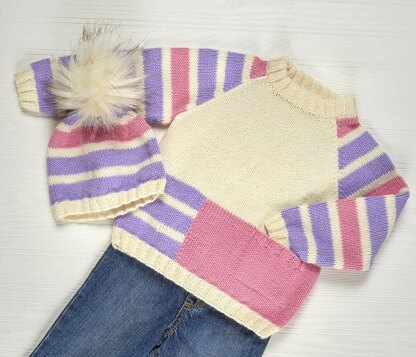 Simply opting for color adjustments, this great ensemble is also brilliantly suited to a boy. Knit throughout in simple stockinette stitch, colorblocking and stripes turn a basic sweater into a show stopper full of charm. The colorblock detail at the bottom of the pullover adds an extra surprise with the addition of a “hidden” pocket, the perfect place to hide tiny treasures. Raglan shaped sleeves ensure a comfortable fit. Hat is knit flat and seamed, but is easily adapted for circular knitting. Sized from a child’s 2 through 8, this raglan pullover with matching hat is a fun and sporty set for any youngster.
