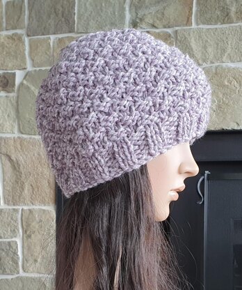 This chunky, quick to knit, family beanie has a 2x2 rib brim then is worked in double moss stitch.