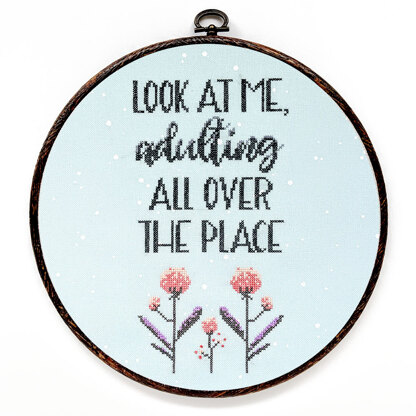 Do you amaze yourself some days with the fact that you made it through the day and coped with all sorts of adult stuff and didn't have a meltdown? It's a fun reminder that you CAN cope with all the shenanigans life throws at you, even on days when you want to throw in the towel and wallow in copious amounts of chocolate and popcorn on your couch. Model stitched over two on Zweigart 32ct Murano Lugana (Mint Splash) and uses French knots. The pattern includes a full colour pattern, full b&w version, as well as a one-page pattern for mobile devices.