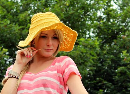 A large brimmed sun hat worked in the round. The brim has a folded hem to hold the wire in place. It has a pretty lace pattern followed by a simple decreasing stocking stitch section which is broken up by purl ridges. The crown ends in purl rows. Aestas is the Roman Goddess of Summer. Unfortunately she is naked except for some wheat in her hair. I think she needs a sun hat!