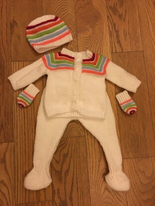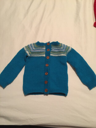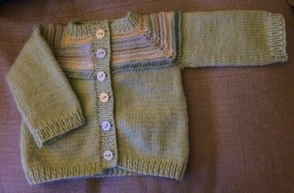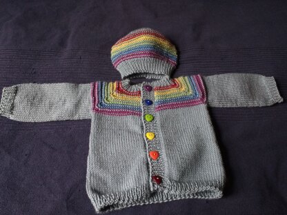 After the Storm hat & cardigan set, sized for approximately 0-3 months. The cardigan is a top-down raglan with a textured yoke of coloured stripes. It features waist increases to accommodate bulky baby bums and is finished with applied button bands. The cardigan body is worked flat, & sleeves are worked in the round. The cardigan measures 44 cm / 17.5” at chest; 16 cm / 6” from underarm to hem.