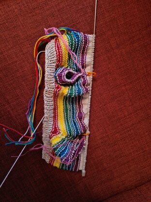 The hat is worked from bottom up, in the round, and features matching stripes. It measures 33cm / 13” circumference.