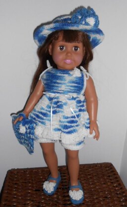 All set for a day in the sun! Pattern includes dress top, bloomers, shoes, wide brim hat and tote.