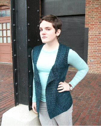 A slightly fitted vest knit in one piece from the bottom up with armbands and collar picked up.