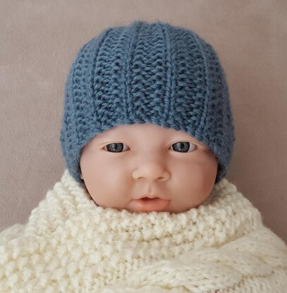 This practical, warm and stretchy 8ply Beanie is worked in broken rib throughout. The photos show the 0 months size.
