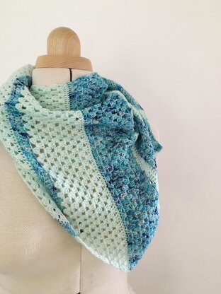 A triangle shaped shawl, worked in two pieces and two colours, using treble stitch rows and granny stripe rows to show off the yarns. The sections are worked from outer corner in, increasing as you go to form the half triangle, the two triangle pieces are then joined to create a centre spine.