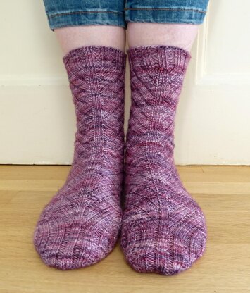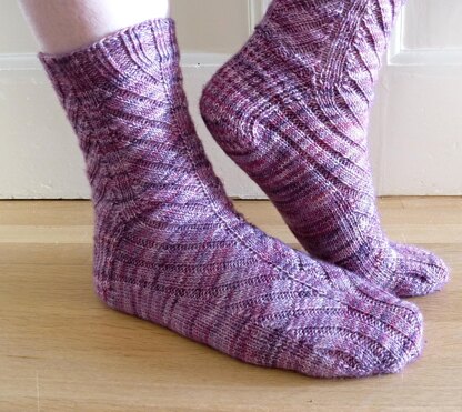 This toe-up sock is really a ribbed design, but with a difference - the gusset springs out of the central column, giving the socks their distinctive diagonal appearance.