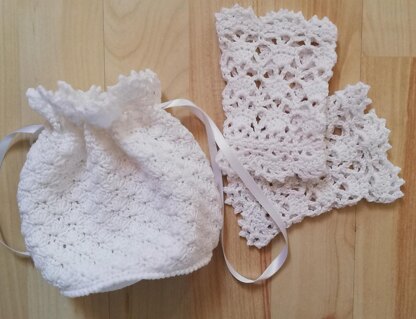 Pattern is for a pair or fingerless gloves and a bag ideal for Communion. Crocheted in 4ply cotton.
