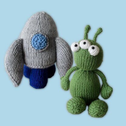 Get set for space adventures with Alien and their space rocket. Designed by Amanda Berry @fluffandfuzz, these toys are knitted in acrylic DK yarns. Most pieces are worked flat (back and forth) on a pair of straight single pointed knitting needles, not in the round. The DPNs are used to knit i-cord for the arms, legs and antennae. For confident beginners and above, other techniques used include casting on and off, knits, purls, increases and decreases, and seaming to finish.