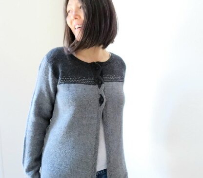 Two-color cardigan worked seamlessly from top down with set-in sleeves worked in round from armhole picked up sts down to cuffs. Slip stitches are used to created details at the yoke.