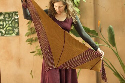 Alines is an asymmetrical triangle designed to play with colour by separating short row colour blocks with bands of stripes. The stripes are perfect for a variegated yarn coordinated to show off the other two colours. The design suits fingering to worsted weight yarn, in a triad of 3 colours: 3 solids/tonals, or 2 solids and a complementary variegated for the stripes. And only 7 ends to weave in. :)