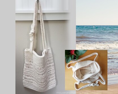 This cross body satchel purse is ideal to carry sunscreen & sandals or to take eco-friendly shopping at the farmers market. Easy to crochet in all basic stitches, simple and quick to work in the round. Seamless no-sew design without a traveling seam. Pouch is made as one piece. A single belt strap is made separately and then laced through eyelets near the top edge before tying together to form a continuous ring that will draw into double shoulder strap styling. Clearly written tutorial includes an abbreviation key with descriptions and a few photos to show how to tie the square knot bow. Stitches: ch, sc, dc, tr, slst