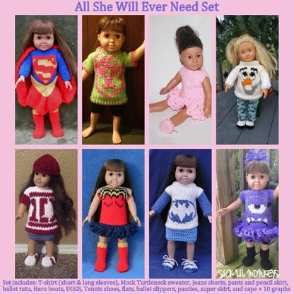 Set includes nine graphs plus a create your own graph AND instructions for the following pieces: Ballet Slippers Ballet Tutu Beach Towel Boots Credits Cape Flats Flip Flops Graphs Hat Hero Flared Skirt Jeans (Pants, shorts, pencil skirt) Panties Sweater T-Shirt (short and long sleeved) Tank Top Tennis Shoes