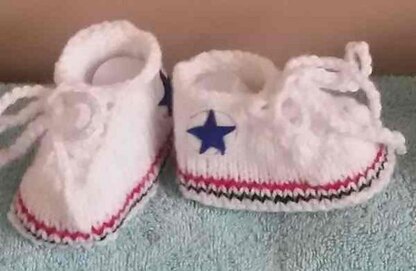 These sneakers have a seamless sole, stitches are picked up to form the shoe. Different size needles give different sizes 3.25 for newborn, 3.5mm for 0-3 month and 4mm for 3-6 month. Felt will be needed to make the stars. Laces can be crocheted, twisted or I-cord.
