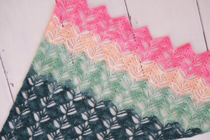 This asymmetric triangular shawl is worked from one corner to the opposite side. The size is adjustable, you can work the pattern repeat until you reach your desired size or you run out of yarn.