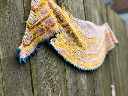 - CONSTRUCTION Shawl is worked from center tab at top to bottom edge, ending with a contrasting picot bind-off.