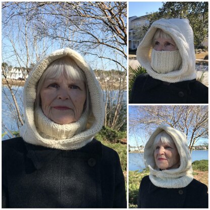 The Alpine Frost is a versatile cold weather garment designed to keep you extra warm. This hoodie cowl can be worn several ways! The cowl portion can be worn around the neck folded in half, pulled up high over the face for those extra blustery days, or pulled below the hood for milder weather. The generous hood has a double layer that frames the face and the hood accommodates layering another hat such as a beanie (not included in this pattern). Featured designs are a double thick hood brim with a lovely cable pattern, a ribbed cowl, and three sizes.