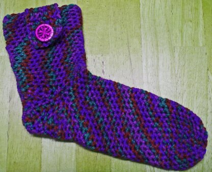 Tension: 7 sts x 7 rows over 5cm x 5cm square, 4.5mm hook (or size to achieve tension), 100g (225m) Beaker Button Bountiful DK, two lockable stitch markers, yarn needle for weaving in ends, 2 Dorset buttons size 2.6cm. Small - 20cm around ball of foot (medium - 22cm around ball, large - 24cm around ball).
