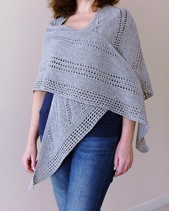Altitude is an asymmetrical triangular shawl that is knitted on the bias and shaped with simultaneous decreases/increases at both edges of the knitted fabric. Alternating sections of garter stitch and open work stitch patterns make this an engaging and, at the same time, a relaxing knit. The finishing touch is made by knitting on a mesh border from the picked up stitches along the edge of increases and the provisional cast-on edge of the shawl.