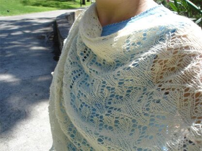 Alvo is an easy triangular shawl worked from the center back downwards to the edging. The body is knitted in a pretty lace st pattern resembling flowers, branches and hearts. The edge has a simple, yet dramatic effect due to the scallop stitch. I think this works beautifully as a wedding shawl too.