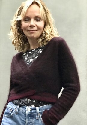 Am I Too Purple? is a lightweight and cozy cardigan…. wearing it feels like a hug!. The cardigan is knitted with a single strand of lace weight mohair, incorporating stripes of alpaca yarn held double. It is a top down raglan construction, with a low V-neckline and a cropped silhouette. It is closed by a tie that can either wrap around the body giving shape at the waist, or tie at the front if you prefer a straight and loose fit. All hems are folded.