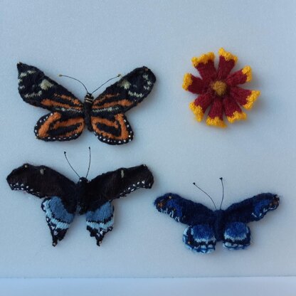 There are three, 9 cm butterflies included in this pattern: the tiger-mimic queen, spicebush swallowtail, red-spotted purple and the pattern for the firewheel flower at the end. Each butterfly is a small project to be done in an evening or so, in scraps of yarn you have lying around! They were knitted flat (with some intarsia color work) on 1.25 mm double pointed needles in a lace-gauged yarn, but can also be done in a heavier yarn and will then turn out slightly larger.