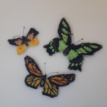 The three life size (between 5½ and 10 cm) butterflies included are the malachite, monarch, California dogface and there’s the blue columbine flower. All are small, easy to medium, fast projects with flat, round and i-cord knitting, intarsia work and loop stitches, done on 1 and 1.25 mm dpn in lace-gauged yarn. All can be done in heavier yarn and will turn out slightly larger.