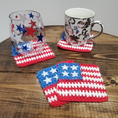 Beautiful patriotic American flag inspired coasters. Worked in rows with multiple colors, this pattern is slightly above beginner difficulty, but those with some crochet experience should be able to follow along with ease.
