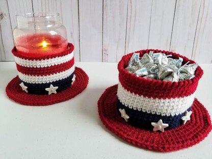 This Americana Hat is the cutest decoration to celebrate Memorial Day, the 4th of July and/or Labor Day! It makes a great gift for a veteran, school teacher, church, community center, etc. The possibilities are endless for what you can put inside the bowl. It can hold candy, a 4” diameter candle or glass jar, a small roll of toilet paper, plastic silverware or rolled napkins at your next cookout, etc. You’re only limited by your imagination!