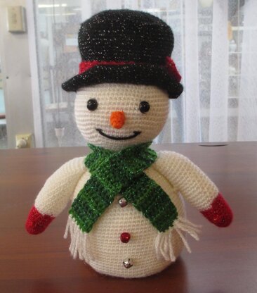 a sparkly snowman. amigurimi worked in the round. 2 balls 50 gram white 1 ball 50 gram black small amount of green small amount of red small amount of orange 3 jingle bells 3.5 mm clover hook