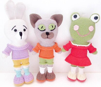 This pattern is for three animals Cat Frog Rabbit They measure around 9 inches/22cm any child or baby would love to play with them, for a small baby you could add a rattle to the body when stuffing. Add a squeaker to the body and they would make a great dog toy, I know my Springer Spaniel puppy approves of them as she stole one and refused to give it back it’s now become her favourite toy.