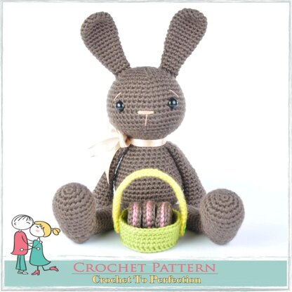 Chocolate Bunny is 12.5” / 32cm tall including her ears if using similar yarn and hook. You can make your Chocolate Bunny smaller or bigger by using smaller size hook with thinner yarn or bigger size hook with thicker yarn. She loves chocolate cookies and has got three of them in her basket.