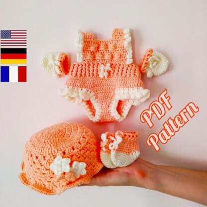 This crochet pattern contains a detailed description with a lot of step-by-step photos of how to create clothes for doll: bodysuit for baby doll, gloves, booties hat and pacifier.