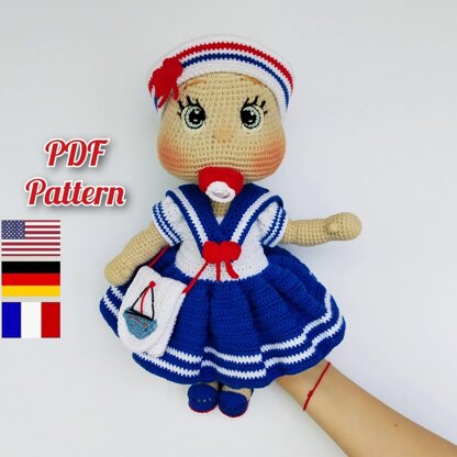 Diese Häkelanleitung enthält eine detaillierte Beschreibung mit vielen Schritt-für-Schritt-Fotos, wie man einen Puppenkörper mit gehäkelten Augen, Kleid, Höschen, Matrosen Mütze, Kragen, Handtasche, Sandalen und Schnuller herstellt.