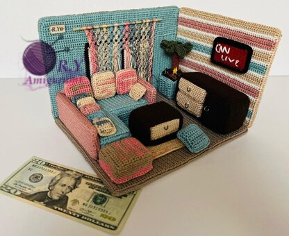 Hello our friends and amigurumi lovers around the world, we designed a fully crocheted living room, starting from the wall design, decoration items and all furniture needed to make it an amazing living room with suitable scale 1:20 that is mean that each 1 m in real equal 5 cm in this pattern, such a beautiful crochet living room will be an amazing gift for a little kid in different occasions or used as a decorated item.
