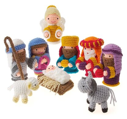 Celebrate the holidays with a sweet little manger scene in the amigurumi style. Made with worsted-weight yarn, this set includes Mary, Joseph, baby Jesus, angel, three wise men, and animals. Standing figures are about 6” tall; animals are 3 1/2”=4” tall, and baby in manger is 2 1/2” x 4”. Pattern is written in American terminology.