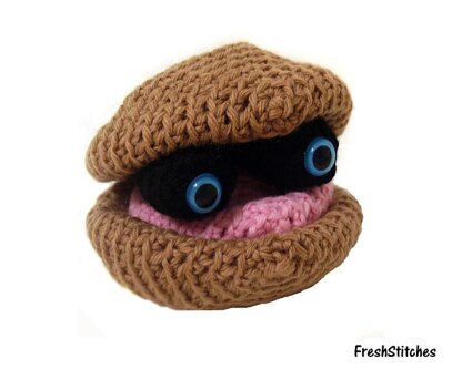 Not only is Stuart an adorable clam... he's a puppet! This amigurumi is constructed so that you can stick your hand in his shell, and even move around his eyes! If you aren't interested in a puppet, simply stuff him, and stitch him closed in the back. This clam puppet measures 4 inches wide by 2 inches tall when completed.