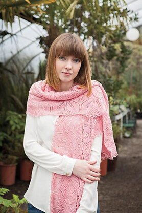 Amillë is a rectangular shawl featuring unique construction. It begins at the center back, with a circular cast on. After the first chart two of the sides are elongated, creating the central strip of leaves. Stitches are then picked up around this edge, and the remainder of the shawl is knit in the round.