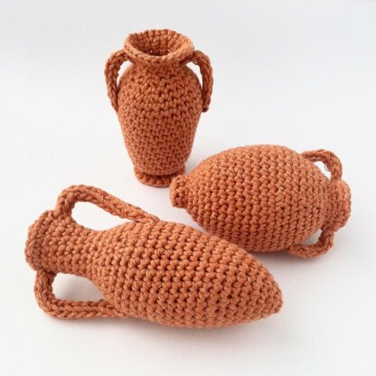 Made in Aran/worsted weight yarn with a 4.5mm hook, the amphorae measure between 10 and 15cm (4” and 6”).